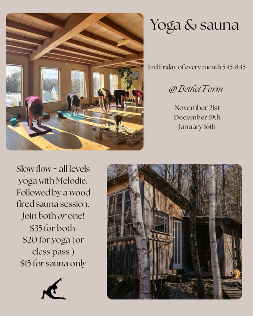 We’ll gather in the wood-fired heated studio, where gentle warmth supports the body unfurling into the practice. After the 75 min class the wood fired sauna will be ready for us to continue the process of releasing and renewing! The pond is available for invigorating cold dips as well.